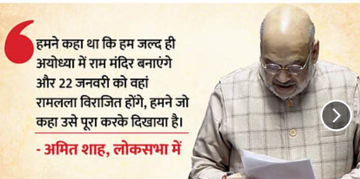 गृह मंत्री ने कहा कि हमने कहा था कि अयोध्या में हम जल्द से जल्द राम मंदिर बनाएंगे और 22 जनवरी 2024 को वहां रामलला विराजमान हो जाएंगे। ये पीएम मोदी की सरकार है, जो कहती है वो करती है। हमने कहा था कि हम संसद और विधानसभाओं में महिलाओं को 33% आरक्षण देंगे। कांग्रेस कई बार सत्ता में आई और तारीखें देती रहीं, लेकिन हमने इसे पूरा किया और बहुमत के साथ महिलाओं को सशक्त बनाया।